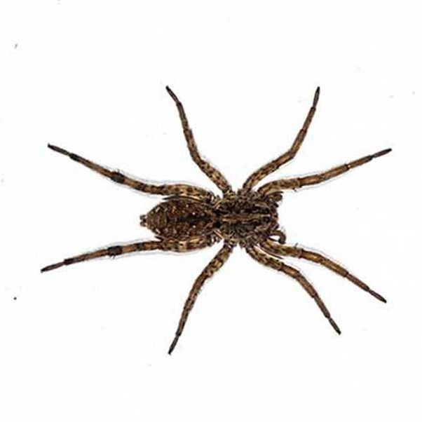Wolf spiders have a mottled grey and brown body, and harbor under leaf litter in the garden or burrows in the ground around your home.